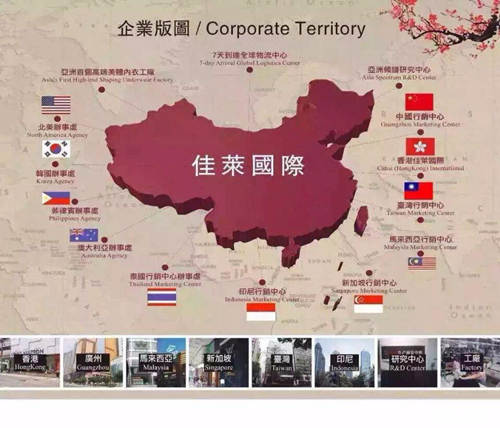 佳莱科技有限公司成立于2009年,注册资金8000万元。现在在18个国家和地区有分公司和旗舰店。中国大陆,中国香港,中国澳门,中国台湾,韩国,日本,新加坡,印尼,马来西亚,法国,德国等。2016年营业额28亿,2017年总营业额35亿,福州公司营业额8000万。