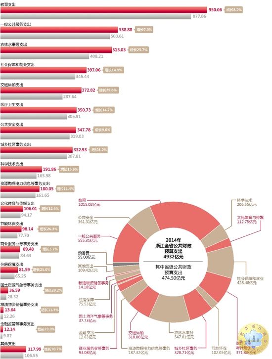 报告中提到,2013年,全省财政支出汇总预算为4730.78亿元,2014年全省财政支出预算拟为4932亿元。不变的是,依旧有三分之二以上的支出用于民生,教育、医疗、社会保障就业等预算都增长8%以上。