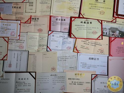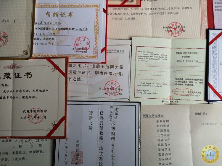 来宾们还翻阅了大量的来自全国各地图书馆发来的《浙山苍 建水长》一书收藏证书,其中不乏来自北京大学图书馆、清华大学图书馆、浙江大学图书馆、武汉大学图书馆等国内一流院校图书馆的收藏证书。对此,唐金荣会长介绍说:本书刚一出版就被全国200多家图书馆争先收藏,40多位全国各地浙江商会会长争先索要、学习、仿效……