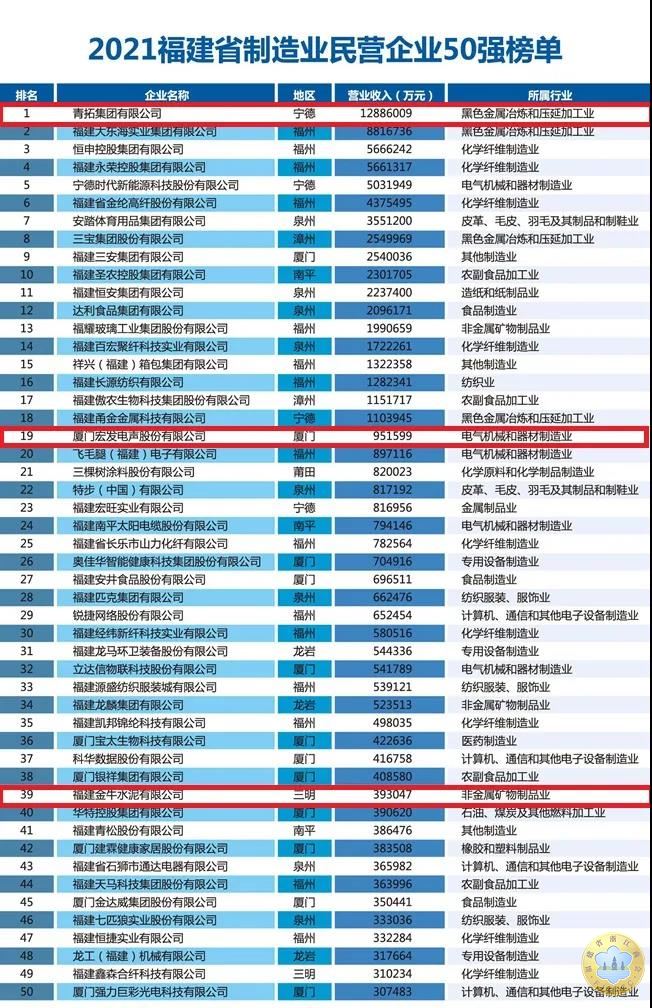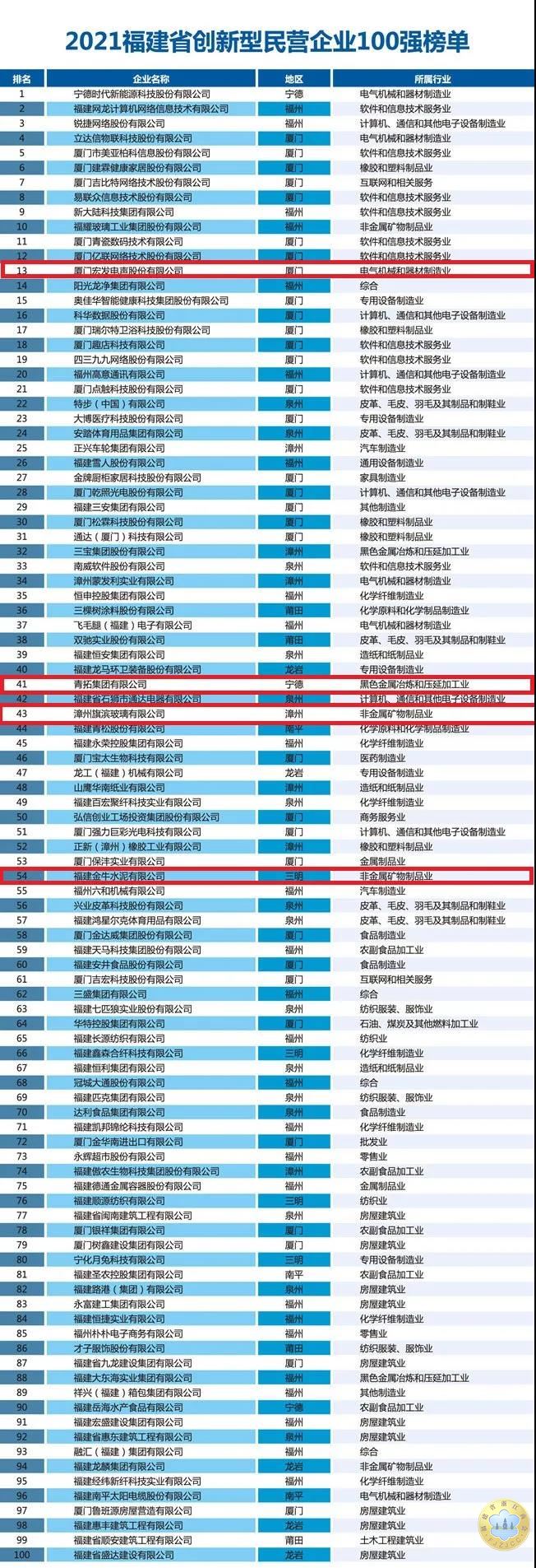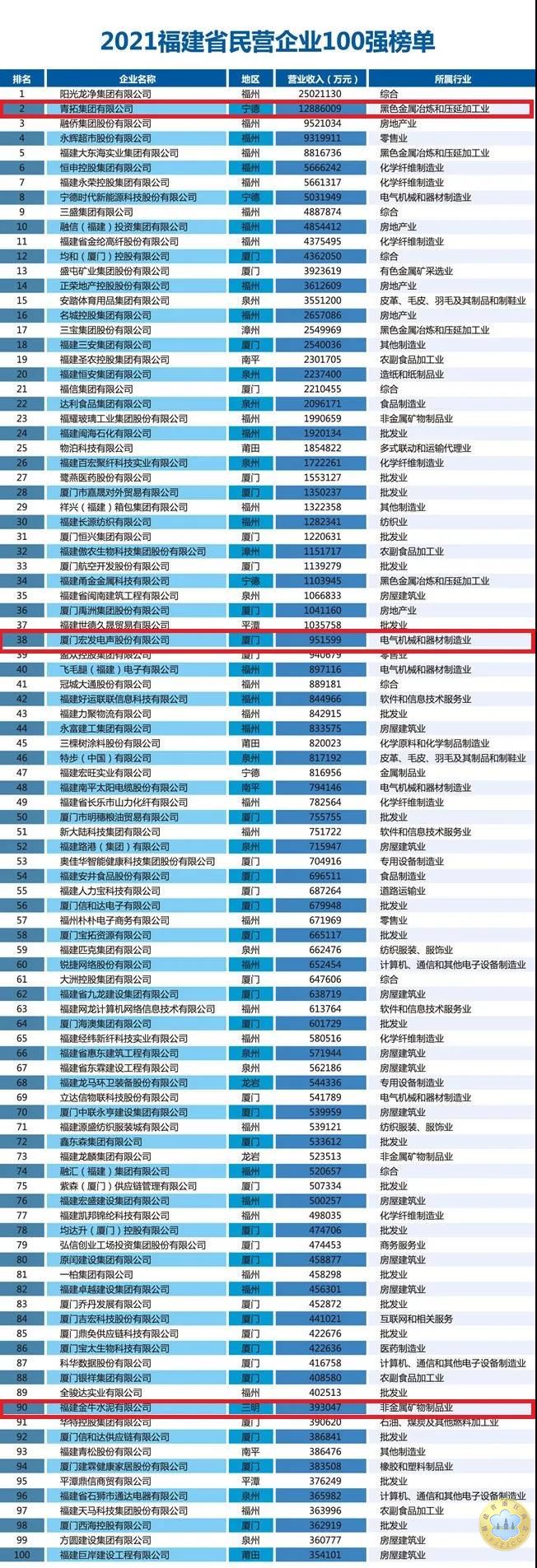 根据榜单,今年福建民营企业100强入围门槛为35.41亿元,比上年增加17.41亿元,增幅接近翻倍,其中阳光龙净、青拓集团突破千亿大关;上榜民营企业百强平均资产总额266.2亿元,平均员工人数7426人,相比上年分别增长18.4%和9.8%,综合实力跃升。